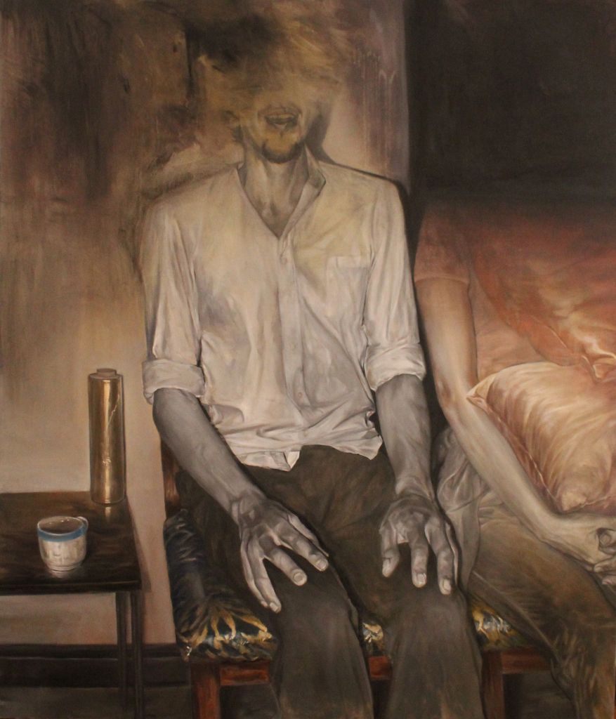 Sergio: Mi paleta está llena de blancos, está llena de grises, me gusta mucho que los colores se los coma el gris. Cuando salí de la universidad, comencé a estudiar a los grandes maestros (los maestros de los cuales me gustaría aprender), comencé a estudiar sus paletas. Muchos de ellos utilizaban paletas con colores tierra, muchos grises y tenían un conocimiento muy profundo de la luz. En este momento, por ejemplo, estoy haciendo un estudio de la pintura barroca -sobre todo de Rembrandt- su última pintura está hecha en colores tierra y sobre esos colores encontramos otros colores en donde hay más luz. Esto permite que la pintura se integre un poco más. Pero, debo decir que pinto con los colores que me gustan, no tengo una escuela y no puedo decir que uso la paleta de los pintores barrocos.