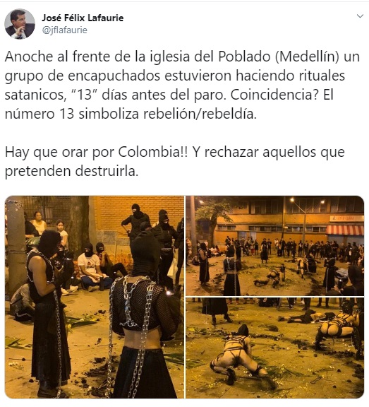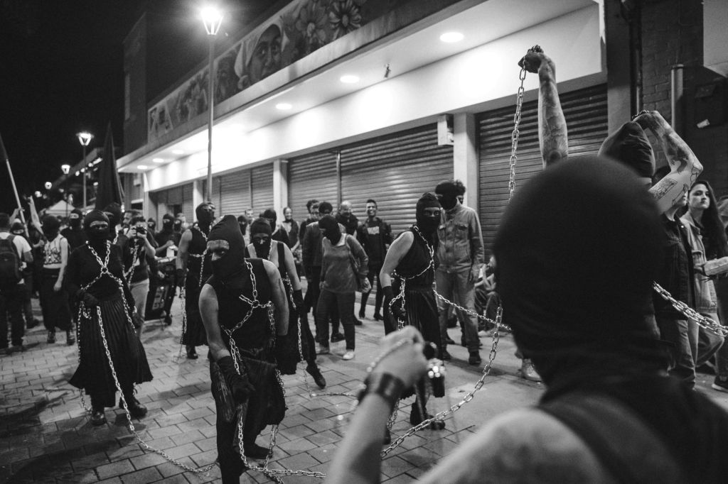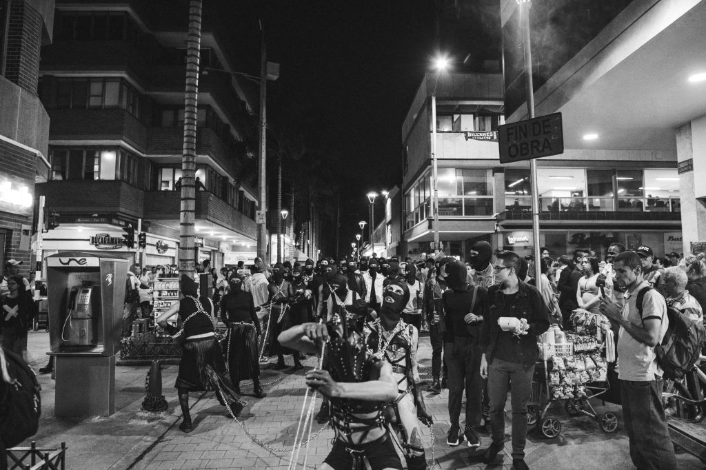 Traducimos nuestro miedo en un lenguaje que también generara miedo, que cuando nos vieran dijeran “ay jueputa”. Habíamos iniciado un laboratorio de danza contemporánea con distintas activistas de la ciudad; empezamos a construir todo esto, le trabajamos como dos o tres meses y luego lo pusimos en el espacio público con distintas características estéticas que generaran miedo. La gente le tiene mucho miedo al diablo, le tiene miedo a lo oscuro y a lo satánico (porque el pensamiento católico es demasiado hegemónico en nuestra cultura y la ha hecho temerosa). Nosotras usamos un poco eso sin hacer un ejercicio satánico, usamos eso para hacer públicas nuestras denuncias. Hicimos un audio donde se archivaban distintos dolores, donde le gritábamos a la gente que “éramos la bestia, maricas salvajes que salieron a cobrar venganza”. Haciendo referencia a las peregrinaciones de la iglesia católica, en las que estas personas se toman los espacios públicos, salen a gritarnos todo su odio y nadie les dice nada.