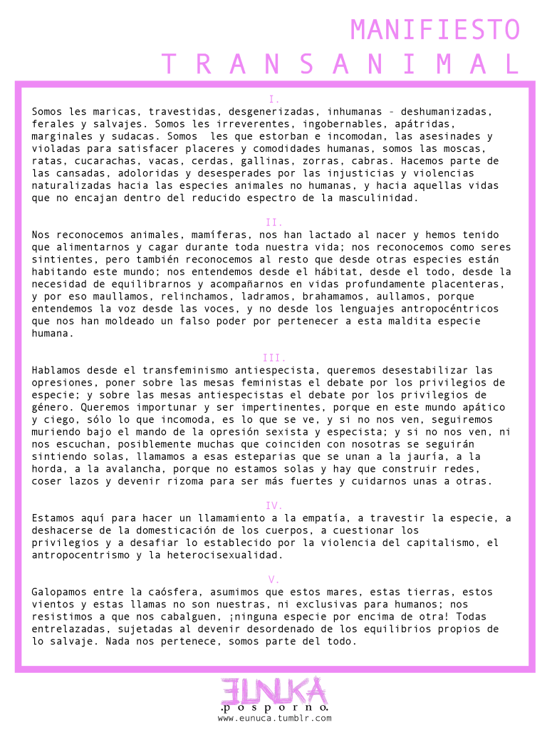 Analú: Hemos llegado a realizar una reflexión que me interesa mucho mientras habito el mundo: ¿cómo hacer para que mi existencia no le genere dolor a nadie? Esto se ha llamado de muchas formas y, en mi experiencia tiene dos facetas: por un lado, es feminista cuando comprendo que el lugar en el que he nacido genera violencia sobre otros cuerpos para poder mantener ciertos privilegios; por otro lado, es animalista cuando comprendo que hay otras especies animales que sufren para que pueda vestirme y alimentarme de cierta manera. Estas dos reflexiones para mí han nacido del mismo problema, pensar esto en los escenarios activistas era muy raro. En los círculos feministas, por ejemplo, hablar de antiespecismo era algo casi incomprensible, no tenía sentido, porque la lucha era contra las jerarquías que genera el sexismo, el patriarcado. Al llegar a un círculo antiespecista que es profundamente radical en sus prácticas (buscan, por ejemplo, el origen de todo para no consumir nada que provenga de animal), puede verse que en la estructura organizativa de estos colectivos -en la mayoría de los casos me atrevería a decir- hay un varón heterosexual que es el que dice cómo se van a generar las acciones y sigue existiendo una división de roles, como si las reflexiones feministas no pasaran por ese espacio. Las violencias se ejercen en los dos campos (hombre y mujer, humano y no humano), por fortuna, fui conociendo personas que también tenían estas ideas en mente, eso no significa que quisiera que tuviéramos un pensamiento ortodoxo; pero ambos lugares eran muy incómodos (los antiespecistas más que los feministas). Al juntarnos pudimos gritarle al mundo: ¡Ey, para nosotras estas dos cosas no están separadas! Hacen parte de una misma forma de pensamiento, de un mismo ejercicio de la violencia en el planeta y queremos ponerlo en discusión. De ahí nace el Manifiesto Trans-Animal, como un llamado para poner el tema en discusión.