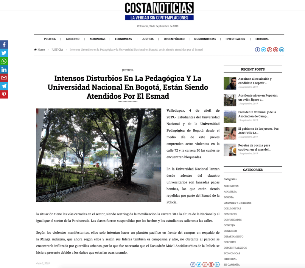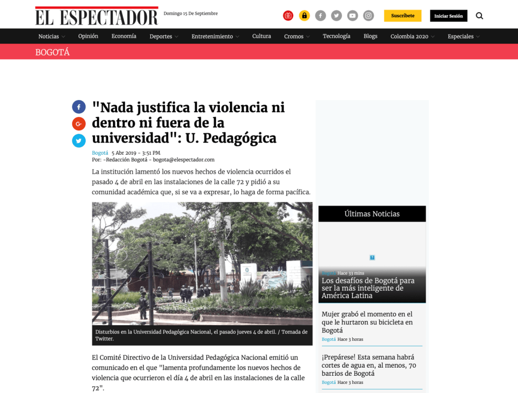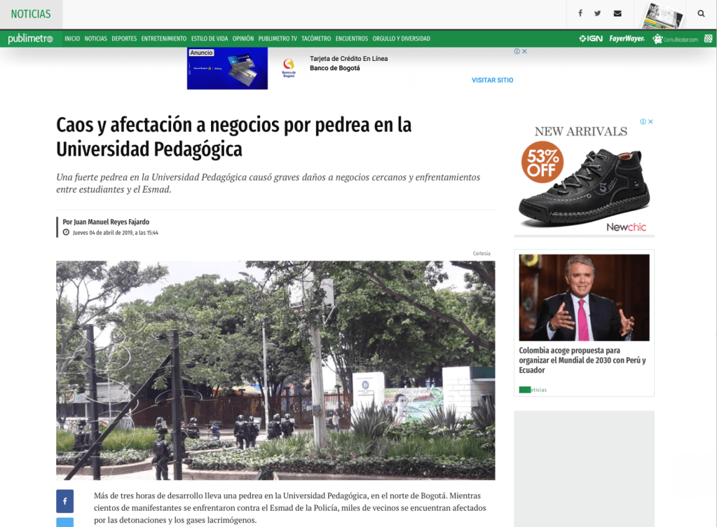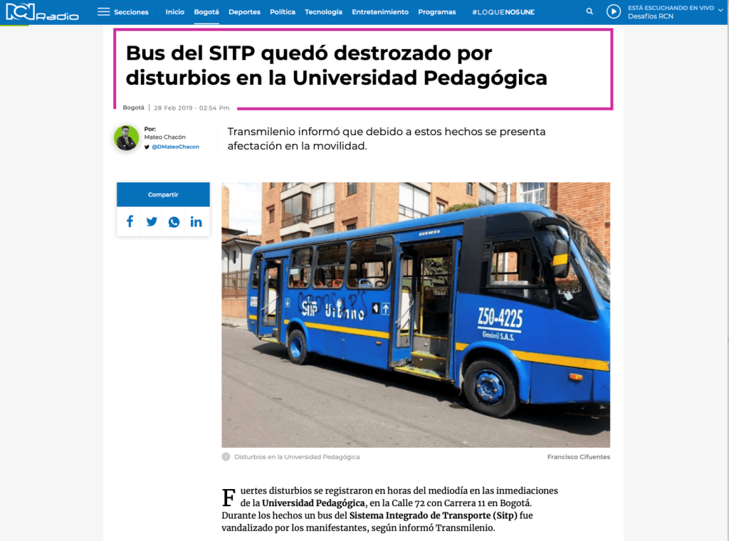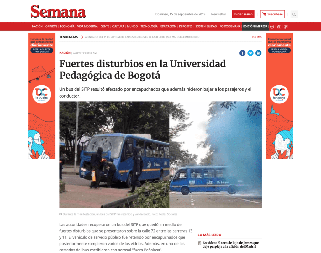 28 de febrero, 12 de marzo, 4 de abril, 9 de mayo, 28 de mayo, 12 y 13 de junio de 2019. En RCN Radio, El Tiempo, El Espectador, Caracol, Costa Noticia, Publímetro, Conexión Capital, Red+, Semana, Pulzo, entre otros medios de comunicación, circularon noticias con titulares como: Bus del SITP quedó destrozado por disturbios en la Universidad Pedagógica; Fuertes disturbios en la Universidad Pedagógica en Bogotá; Protestas en las universidades Nacional y Pedagógica no dejan heridos; Intensos disturbios en la Pedagógica y la Universidad Nacional en Bogotá están siendo atendidos por el Esmad; Bloqueos por protestas en universidades Nacional y Pedagógica en Bogotá; Protesta en la Universidad Nacional y Pedagógica en apoyo a la minga; Policías y encapuchados se enfrentan en la Universidad Pedagógica; Nada justifica la violencia, ni dentro ni fuera de la universidad; Caos y afectación a negocios por pedrea en la Universidad Pedagógica; Grave situación de orden público en la Universidad Pedagógica; Disturbios paralizaron la movilidad en inmediaciones de la Universidad Pedagógica. Se registran nuevos disturbios en cercanías a la Universidad Pedagógica; Se volvió costumbre: estudiantes de la U. Pedagógica se enfrentan al Esmad.