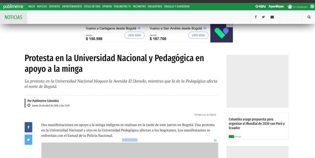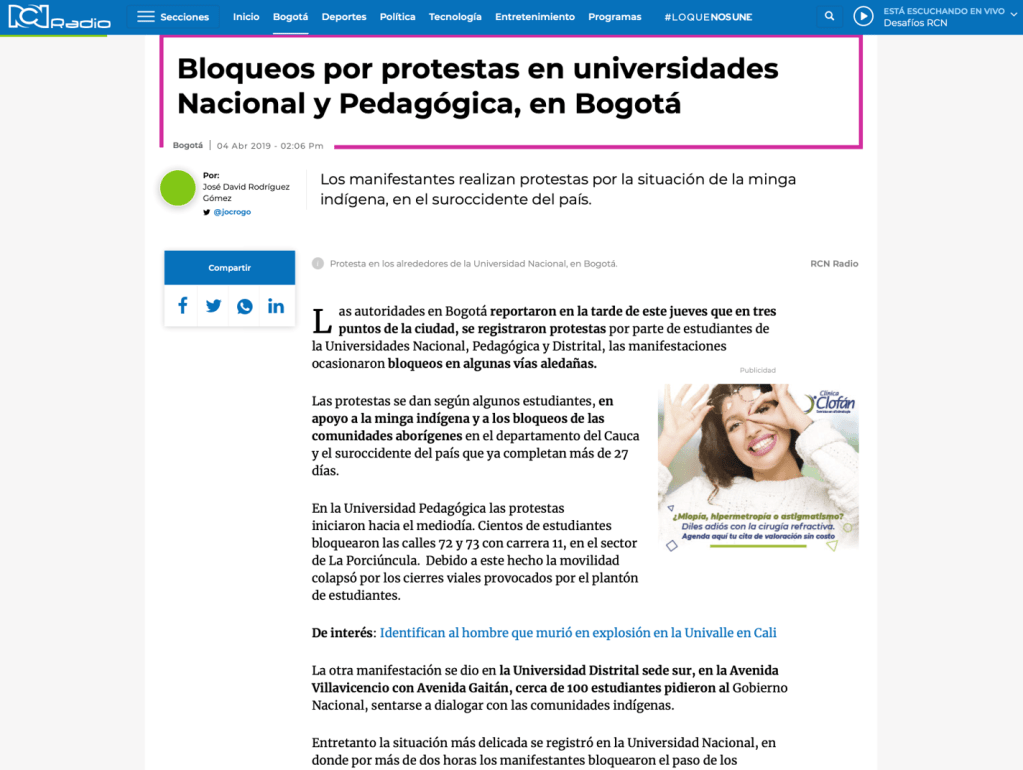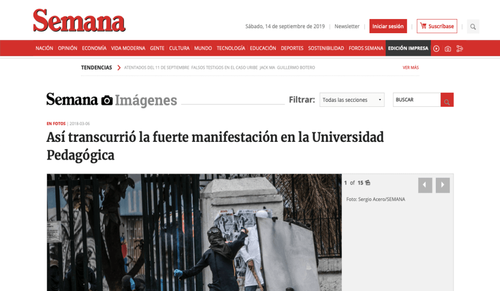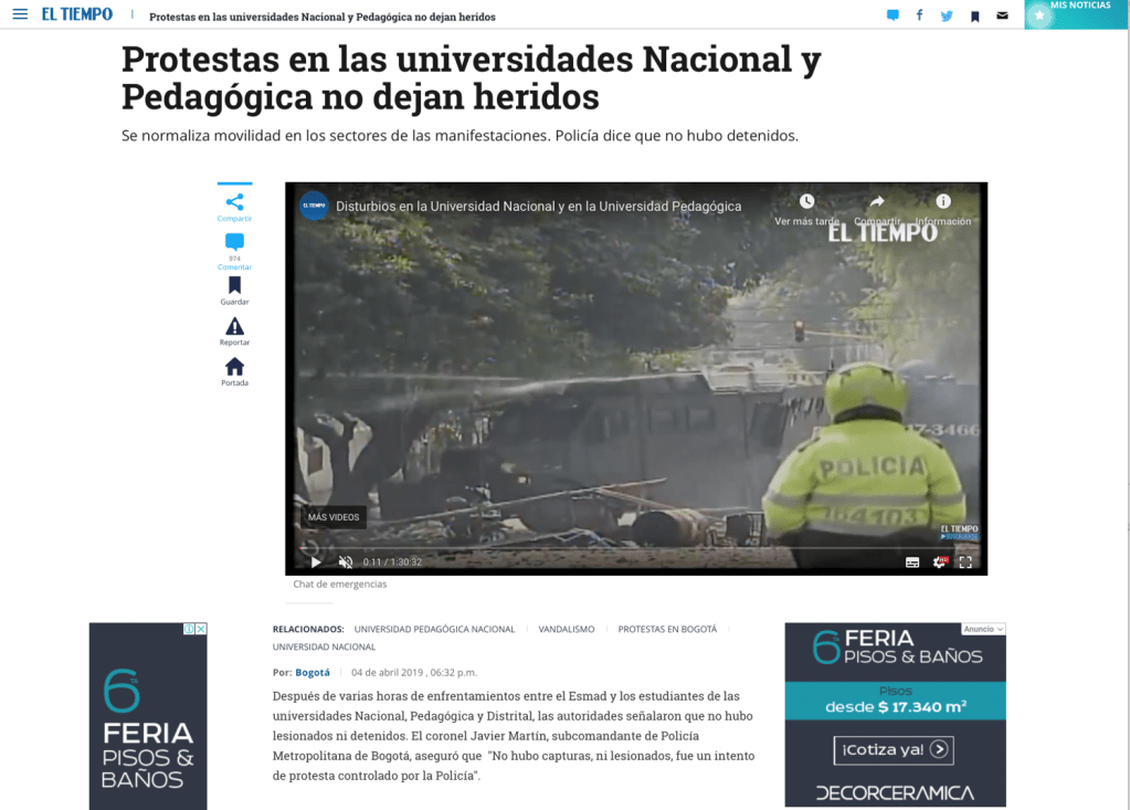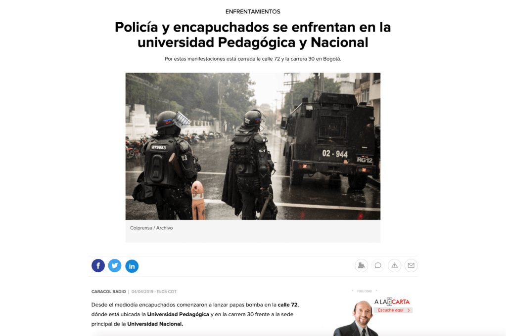28 de febrero, 12 de marzo, 4 de abril, 9 de mayo, 28 de mayo, 12 y 13 de junio de 2019. En RCN Radio, El Tiempo, El Espectador, Caracol, Costa Noticia, Publímetro, Conexión Capital, Red+, Semana, Pulzo, entre otros medios de comunicación, circularon noticias con titulares como: Bus del SITP quedó destrozado por disturbios en la Universidad Pedagógica; Fuertes disturbios en la Universidad Pedagógica en Bogotá; Protestas en las universidades Nacional y Pedagógica no dejan heridos; Intensos disturbios en la Pedagógica y la Universidad Nacional en Bogotá están siendo atendidos por el Esmad; Bloqueos por protestas en universidades Nacional y Pedagógica en Bogotá; Protesta en la Universidad Nacional y Pedagógica en apoyo a la minga; Policías y encapuchados se enfrentan en la Universidad Pedagógica; Nada justifica la violencia, ni dentro ni fuera de la universidad; Caos y afectación a negocios por pedrea en la Universidad Pedagógica; Grave situación de orden público en la Universidad Pedagógica; Disturbios paralizaron la movilidad en inmediaciones de la Universidad Pedagógica. Se registran nuevos disturbios en cercanías a la Universidad Pedagógica; Se volvió costumbre: estudiantes de la U. Pedagógica se enfrentan al Esmad.