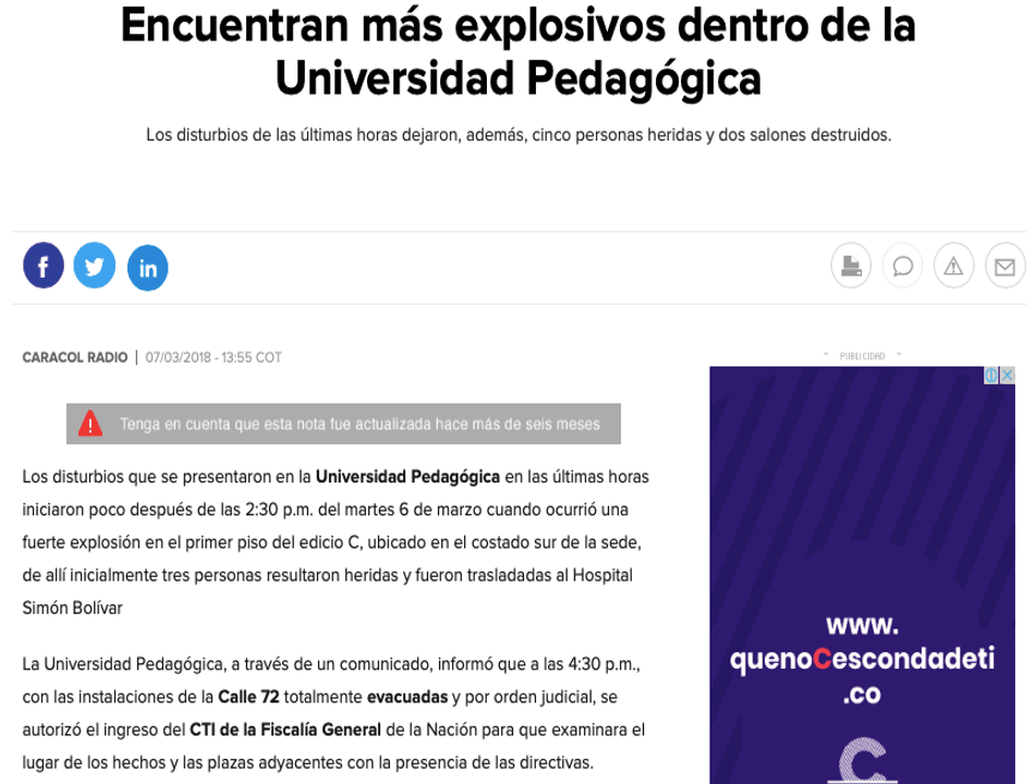 7 de marzo de 2018, 1:55 p.m. “Encuentran más explosivos dentro de la Universidad Pedagógica»