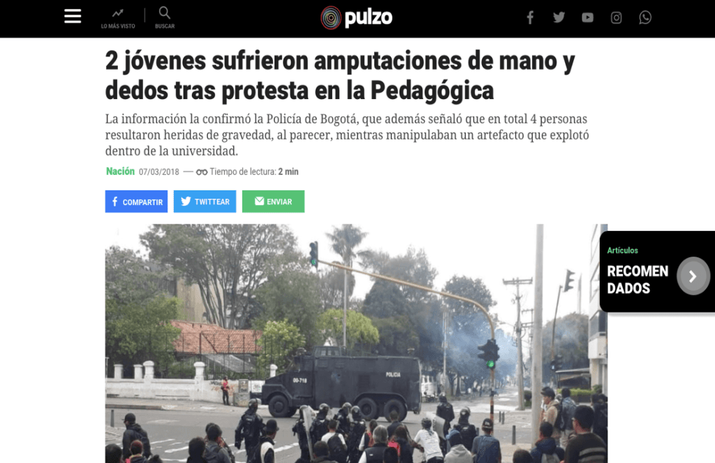 «(…) Entre las víctimas hay uno que presenta amputación de varios de sus dedos, otro perdió la mano derecha, uno más tiene laceraciones en las manos y el cuarto lesiones de consideración en los ojos. Lo anterior lo informó en rueda de prensa el coronel Daniel Gualdrón, comandante operativo zona norte de Bogotá, que también explicó: -La explosión fue dentro de un aula. Desconocemos cuál fue el motivo, pero al parecer fue una mala manipulación de estos elementos explosivos. Los disturbios se mantuvieron por lo menos unas 4 horas y dejaron millonarias pérdidas en los locales y negocios que funcionan en la zona financiera del centro de la ciudad. (…) La universidad informó que las clases se reanudarán hasta el próximo lunes 12 de marzo, como consecuencia de los desmanes y las afectaciones que hubo en la institución (…).” Medio de comunicación digital Pulzo