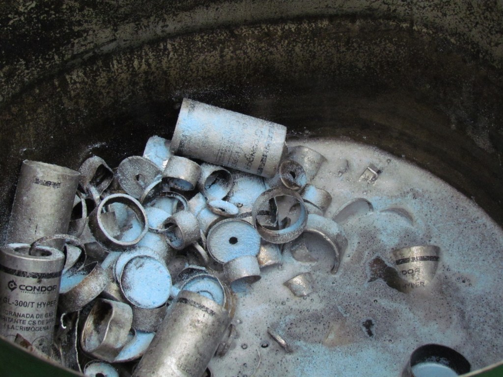Los residuos de estos enfrentamientos nuevamente nos confrontan, esta vez: las granadas de las armas químicas cargadas de compuestos lacrimógenos que el ESMAD de la policía arroja en respuesta a las piedras lanzadas por los encapuchados, con la finalidad de dominar el cuerpo de los manifestantes, causando una incapacidad temporal por intoxicación química. Los cartuchos de estas granadas son fabricados con aluminio, un metal muy común que, en estado natural, se encuentra en la mayoría de las rocas.