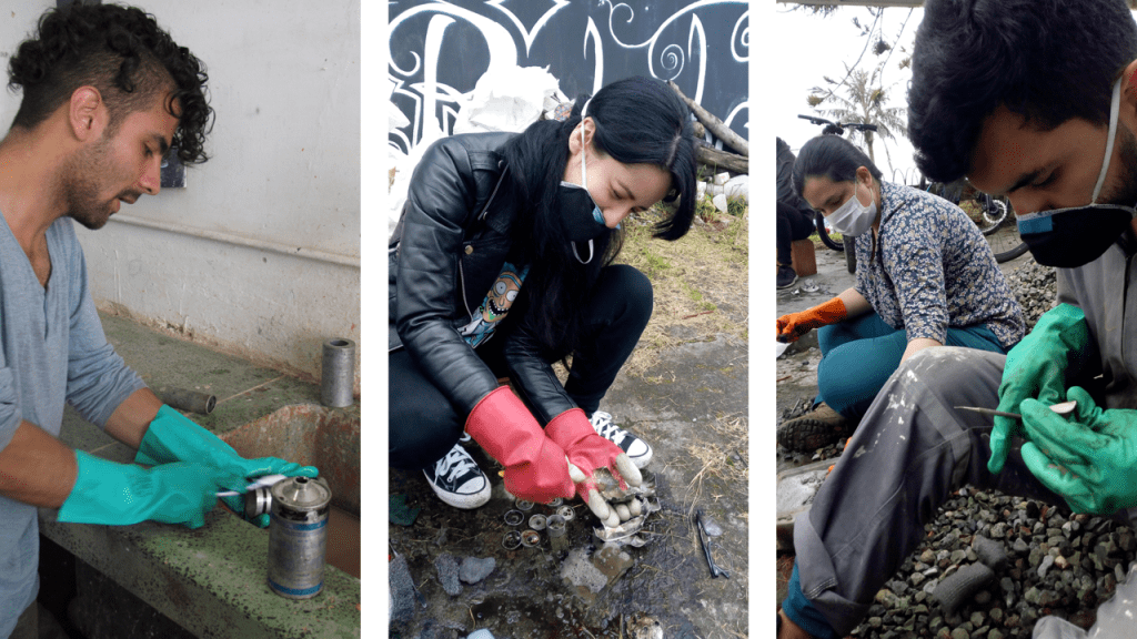 Acudimos al fuego como agente transformador de los cartuchos de las granadas recolectadas en los tropeles, para someter el aluminio a un proceso de fundición en el que —a través de una temperatura elevada— se modifica el estado de agregación de la materia, de sólido a líquido, permitiendo volver a figurar el material.