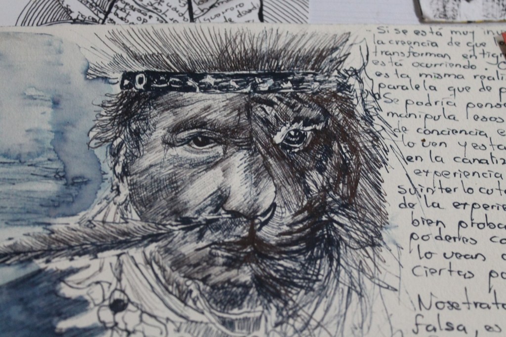 Después de mi tesis de pregrado, realicé una investigación de maestría y tuve la oportunidad de estar un tiempo con los indígenas, los kamsá del alto Putumayo y los kofán del bajo Putumayo. Debido a que tenía rituales todos los días de tomas de yagé, a veces no podía distinguir lo que era real y lo que no; finalmente llegué a la conclusión de que todo era real, estaba en estados modificados de conciencia muy fuertes. Algo importante de la manera en que asumo estos rituales y que es parte de mi obra es el diario de campo, siempre tengo un diario donde puedo escribir, donde puedo dibujar, donde puedo darles un orden a mis visiones, a mis ideas, para que todo no sea difuso. Los diarios son un medio importante, son libros de artista y los presento en las exposiciones, al finalizar las investigaciones.