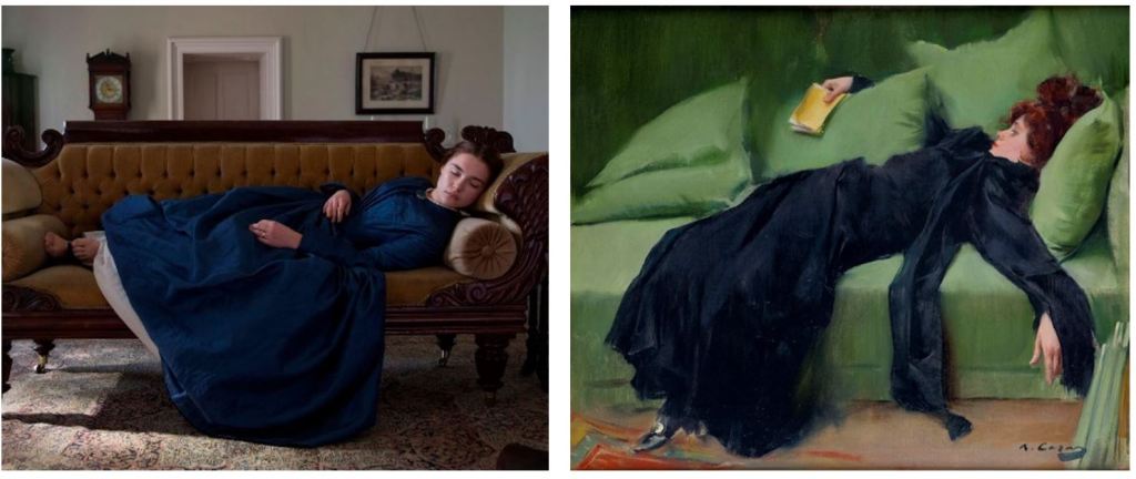 (ii) El arte como un estudio de atmósfera. Ciertos directores, para la realización de películas de época, se valen de los cuadros de género: estudios del vestuario, del mobiliario y los paisajes urbanos. Ejemplos recientes de esto pueden apreciarse en La favorita (Lanthimos, 2018), nominada a mejor película en los premios Oscar del año pasado (2019), que se luce en aspectos como el diseño de vestuario. En otra película, quizá no tan aclamada, Lady Macbeth (ver figura 2), no solo se retratan con precisión los elementos visuales que nos sitúan en cierta época, sino que, muy al estilo del pintor simbolista Vilhelm Hammershoi, se hace uso de la luz y del color para generar atmósferas que le despierten al espectador tal o cual sensación.