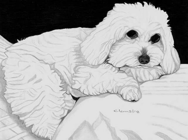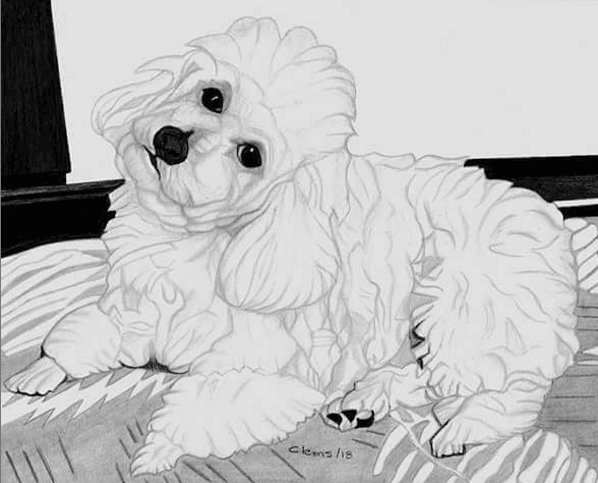 Creo que estos “vestidos de plastilina” de los que habla Beard se pueden observar fácilmente en los dibujos de animales que hace Clemencia. Tommy, por ejemplo, es un french puddle con pliegues extraños, un pelaje solamente insinuado y unos bordes en ocasiones muy rectos. Pero todo esto se desvanece cuando vemos su carita coronada por esos ojos llenos de ternura, esa pose que solo los animalitos saben hacer y que, personalmente, me parece entrañable. Hay algo en el dibujo de Tommy que me recuerda a la escultura de Frasiclea cuyas formas solo se nos enseñan para señalar lo que estaba “mal hecho” y cómo “mejoró” con el paso de los años. Pero Beard nos habla de esa belleza que deja atrás el “progreso”: seguro que como Tommy nos mira, no nos mirará la obra más hiperrealista, porque los avances artísticos no son lineales, ni son solo en el ámbito de la creación de nuevas herramientas para los artistas. Hablar de unos “avances técnicos” es caer en el error de clasificar diversas formas de representación como si fueran obsoletas, basado en un criterio de figuración impuesto por ideales académicos.