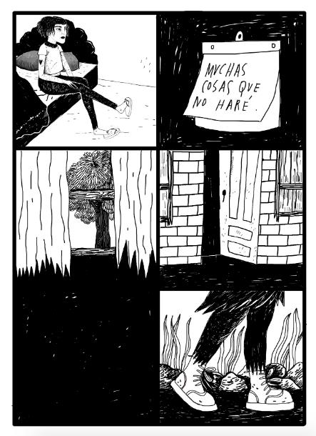 Laura: «La culpa femenina» es el fanzine que coeditó el colectivo feminista Somos Hiedras (Medellín), junto a Dr Fausto (Manizales). Dr. Fausto una es una publicación hecha por Ed Muñoz y Reptil, ellos son diseñadores, fanzineros e historietistas y en esta edición, invitaron únicamente mujeres para dibujar sobre la culpa femenina. Yo dibujé esa culpa desde mi percepción, esas cargas que nos echamos encima, el peso de lo cotidiano, de lo que significa ser una mujer y estar inmersa en el enorme engranaje del trabajo asalariado pero al mismo tiempo querer corresponder al trabajo doméstico, la carga que significa escuchar a los demás y ser receptiva siempre, ser responsable por el bien de esos vínculos afectivos, todas esas cosas que generan pesadez y cansancio emocional para luego como en la sexta viñeta decir: NO, detengan todo, estoy cansada, no quiero esto, yo lo que quiero es irme lejos, para el monte, ser una anarquista primitivista, no tener que ser responsable por todas esas cosas de mierda, ADIÓS. Así mismo la idea fue invitar sólo mujeres para abordar ese tema desde distintos bandos, una juntanza que hizo visible nuestro trabajo; ahí está Nube, Kathiushka, Cindy elefante y otro montón de chicas demasiado tesas con las cuales me siento muy orgullosa de compartir páginas.