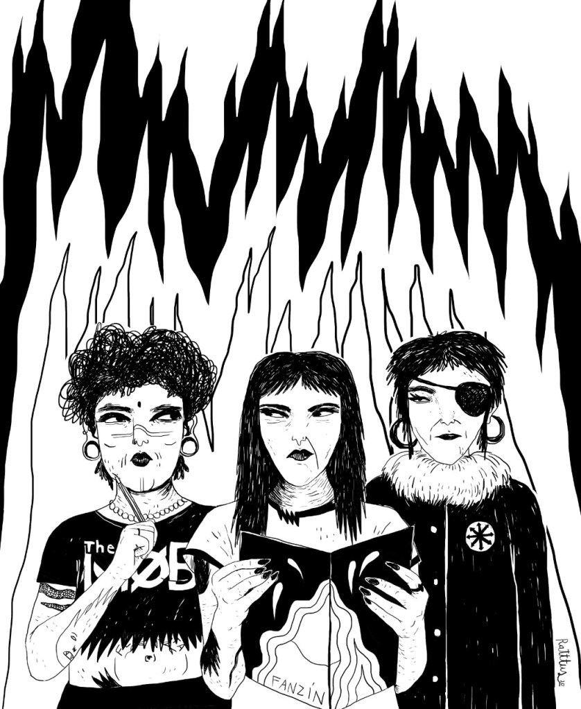 Laura: A mí me gusta el punk desde que estaba chiquita, ha sido una línea que ha direccionado mi trabajo y las búsquedas que he hecho teóricamente pero no me atrevo a definirlo o encuadrarlo en márgenes estrechas, es una forma de vivir contraculturalmente. Mi interés principal o por lo menos a lo que me estoy dedicando ahora es a hallar la relación de las mujeres en los espacios contraculturales y como lo manifiestan visualmente. Ahí entra el fanzine, pues es súper underground. En los 90’s el punk comenzó a crecer y el fanzine se convirtió en la herramienta por excelencia de difusión de los contenidos y la teorización de las personas que se enuncian desde el punk. Siento que todo tiene que ver, lo que dibujo está condicionado por la música que escucho y los espacios que frecuento. A grandes rasgos, mi dibujo está condicionado por lo que soy, pienso y siento. Aunque el punk sea un espacio hostil, yo siento que esa misma hostilidad hace que el trabajo tome cierta línea. No solo por el estilo que adquiero, si no por las cosas que me estoy preguntando y lo que estoy investigando.