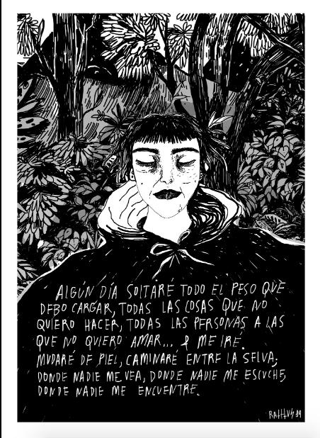 Realmente, no sé si pueda decir que soy una mujer empoderada pero sí creo que he encontrado, por ahora, un gran lugar que es el dibujo para sentirme poderosa y útil en esta ardua tarea de resignificar nuestra existencia lejos del patriarcado, prejuicios, racismo, sexismo, clasismo y demás comportamientos e ideas que violentan nuestra vida y existencia en condiciones dignas y equitativas. Hay muchos frentes desde los que podemos trabajar en pro de esta tarea y crecer personalmente, autocuidarnos, amarnos sin romantizar el amor propio, reconocer nuestros errores y aciertos. El dibujo es el mío. El hecho de ser mujer y artista, además, hace que una se eche al hombro ciertas responsabilidades, que no son una carga, si no unas luchas a las que una le entrega la vida. Yo pienso que la vida no sería lo mismo si una no la pusiera en función de algo, en mi caso lo importante es el dibujo y los feminismos. Mi lucha es esa, junto a otras chicas hacer visibles nuestras preocupaciones e ideas, transformarnos y transformar nuestros espacios más cercanos.