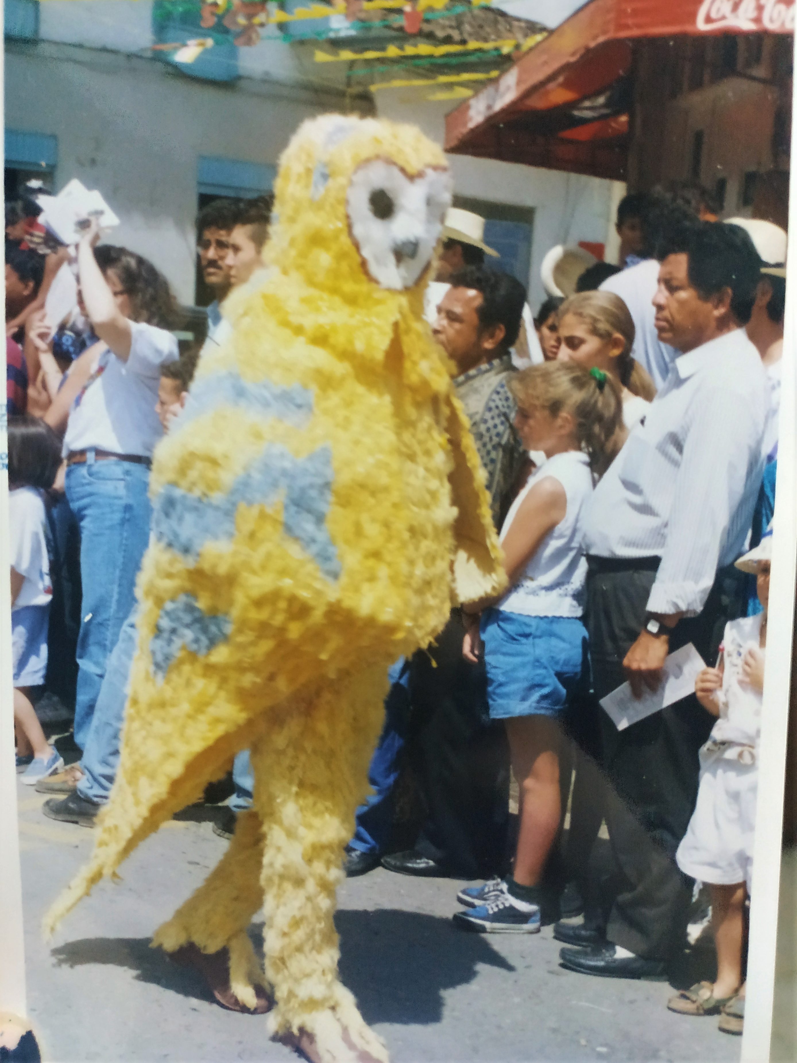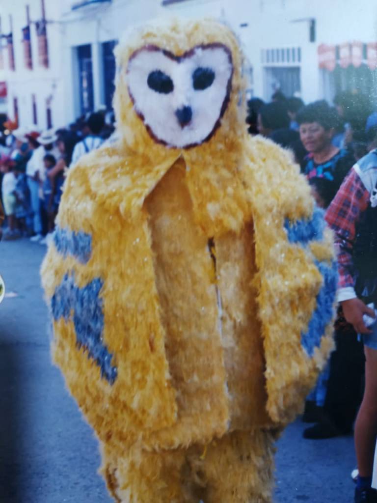 Sacamos varias cuadrillas basadas en pájaros como aves de rapiña, búhos, avecitas cantoras, entre otras, hacíamos primero el armazón con alambre y tela sencilla, luego lo cubríamos con plumas de gallina teñidas. Hoy en día es muy fácil porque en las avícolas sobran las plumas, en aquel entonces esto era todo un proceso porque había que conseguir las plumas, había que quitarles la grasa hirviéndolas y luego teñirlas en anilina con los colores que necesitábamos y, por último, fijar una por una, sobre el cuerpo del animal con pegante.