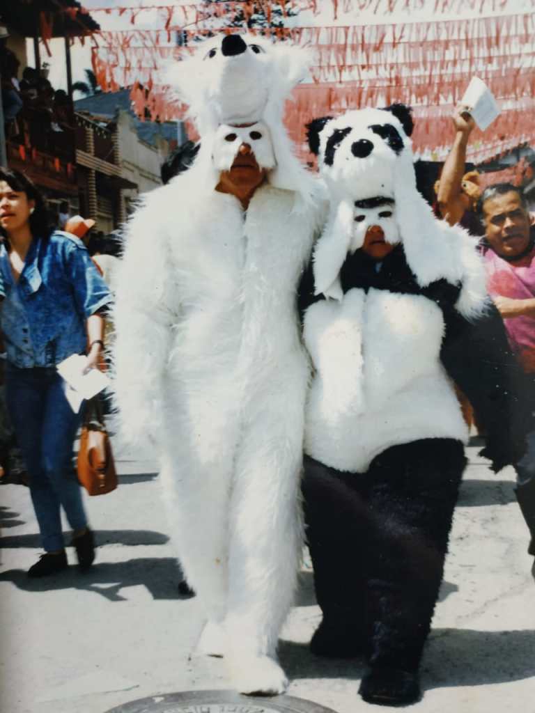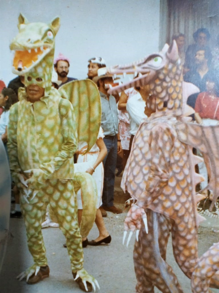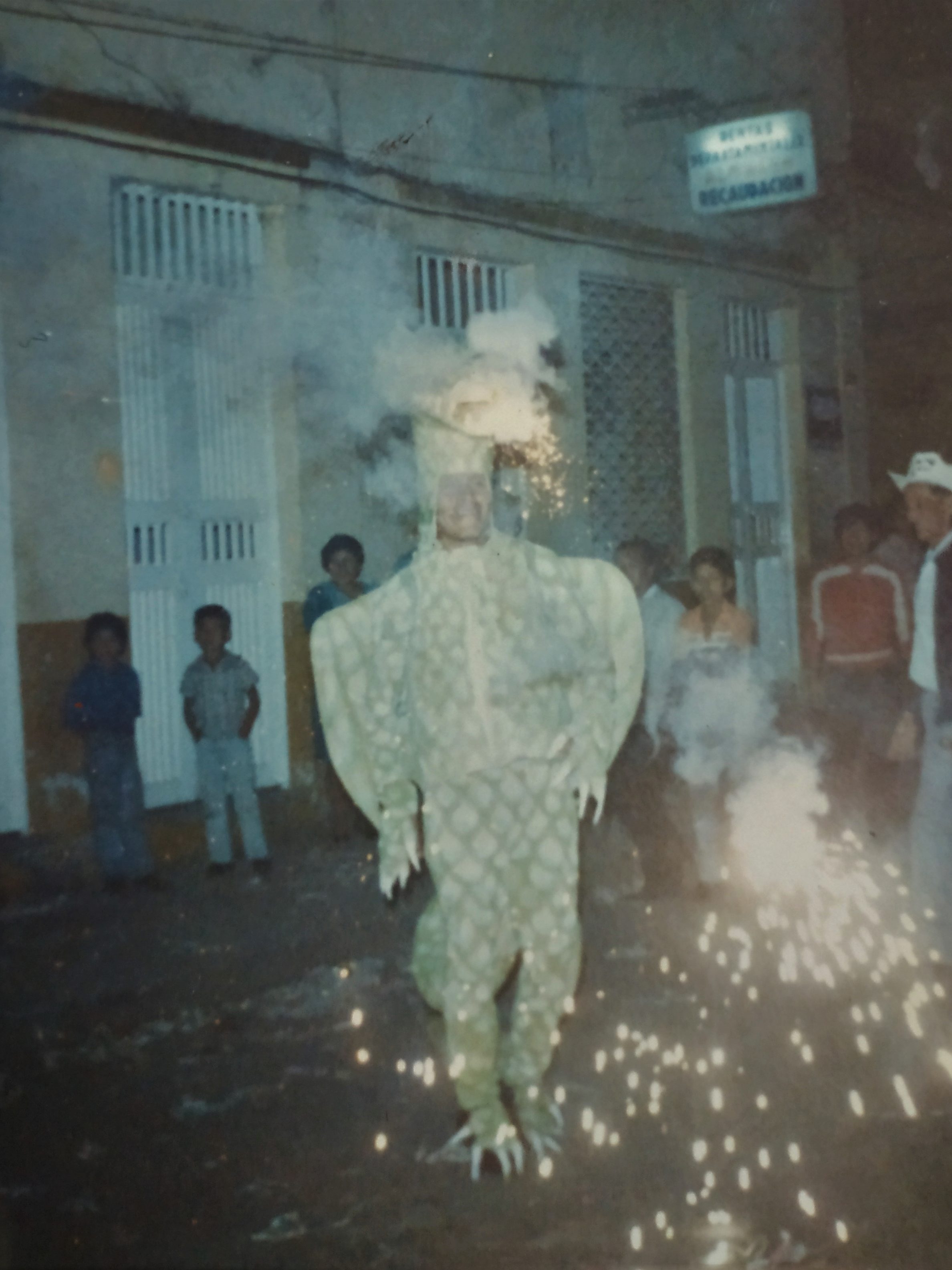 También recuerdo los dragones, una de las primeras cuadrillas que realizamos, éramos muy nuevos en el grupo, entonces, nos valimos de un artesano que tenía mucha experiencia para que modelara las cabezas de dragón, pero nunca nos explicó como los hacía, sabíamos que modelaba la parte principal en barro, los hacía muy bien hechos. Nosotros hicimos el resto de las partes del cuerpo y con unos tacos de pólvora simulábamos el fuego, colocándolo dentro de la boca del dragón, botaba fuego y humo.