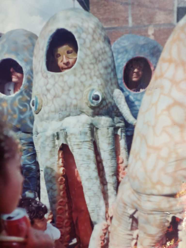 Cuando queríamos diseñar un disfraz nos fijábamos en la forma del animal, intentábamos equiparar sus dimensiones con las de la persona que lo portaba. Recuerdo los pulpos, el disfraz tenía un espacio para poder mirar, hicimos los tentáculos y las ventosas con espuma cosida, el pulpo se forró con tela y se pintó con esmaltes. Los tentáculos eran accionados con nailon para que no se notara mucho en el público, ideamos la forma para que el movimiento fuera discreto, halábamos los hilos desde adentro y se veía muy realista.