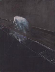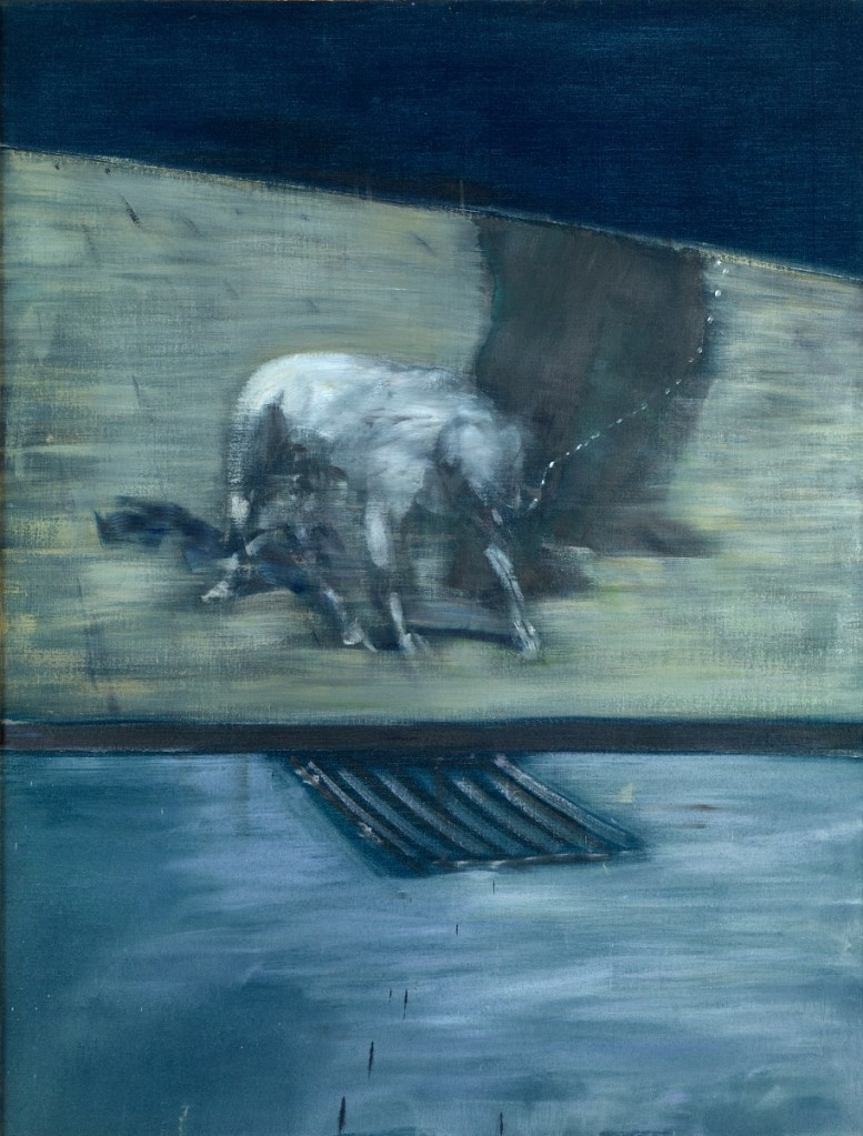 Sus pinturas de perros fueron basadas en las fotografías time lapse de Animales en Movimiento de Edward Muybridge (1887), aunque las de perros especialmente no generaron mayor interés en el público (ya que la fama de Muybridge se dio por sus fotografías de caballos de carreras). Entonces, ¿por qué Bacon decidió abordar desde sus brutales pinceladas la cruda visión que tenía de esos caninos? La respuesta que encuentro es la inquietud que estos animales le causaban: las crueles manchas pálidas que se superponen entre sí, formando la sombra de un hocico, cuatro patas desvanecidas en un fondo melancólico, son todo lo opuesto a como suelen retratar al llamado “mejor amigo del hombre” (que suele ir acompañado de tonos cálidos, fondos alegres y sensaciones de ternura). Bacon, como suele hacer con sus obras, interrumpe esta animosidad mostrando a los perros en un ambiente decadente que, sin necesidad de rasgos definidos, nos hace ver a estos animales con una desesperanza parecida a la que siente el humano.