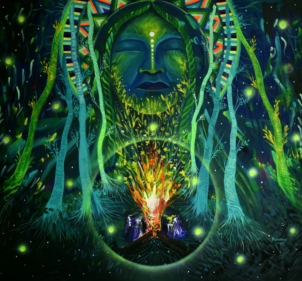 También aprendí a recibir. Por ejemplo, yo dije: “Hasta aquí, se murió todo”, pero al día siguiente recibí muchos mensajes de la gente que conocía el proceso, de personas de la comunidad que me daban una voz de aliento, me decían que me querían apoyar para que no se acabase Benach, que tenía que seguir la galería en el territorio. Aprender a recibir todo ese apoyo fue lo que me llevó a levantarme otra vez. Me permitió volver a reconstruir el espacio, volver a comprar las cosas para seguir trabajando, volver a empezar y comprender que el arte y el tejido que había sembrado en ese momento dio frutos. Para mí fue bien bonito ver cómo la gente pedía ese espacio y darme cuenta de cómo había incidido de una manera positiva dentro del territorio. Durante ese acontecimiento estuvo otra vez pausada la pintura mientras reconstruíamos todo y cuando por fin decidí continuar llegó la imagen de la mujer con el fuego. Es una obra que tiene en el centro una tulpa, uno de los rituales comunitarios en los que el espíritu del fuego siempre ha estado presente, que representa la fuerza espiritual que me permitió volver a organizarme para retomar mi camino. Uno de los mensajes que busca transmitir la obra es que desde las cenizas se vuelve a tejer otra vez la historia: mientras la raíz esté sembrada hay una esencia que puede volver a revivir y a continuar.