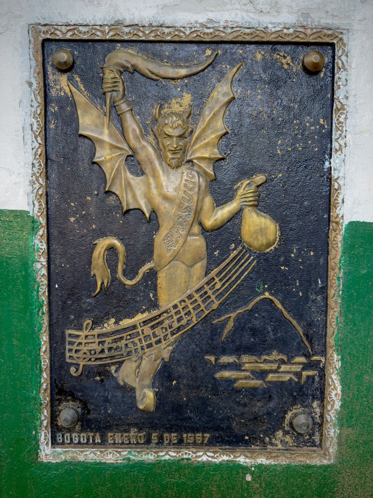 ¿Cómo no tener por el diablo y por las artes tan apasionado fervor si en Riosucio, carente de estatuas, fue él quien me acercó con su figura de bronce a las formas de la fundición? Con su mirada amistosa y de forma tan piadosa se acercó a mí, reducido a mi estatura, para que pudiera observarlo, gozar y admirarlo, sentir con mis manos el detalle de cada una de sus formas. El mismísimo diablo, esculpido al altorrelieve sobre una placa —emblema a su vez de la junta del carnaval—, con una antorcha en su diestra y un calabazo en su siniestra, vistiendo la banda de quien es el presidente y regente de la fiesta. Surca los cielos por encima del Ingrumá y se encuentra envuelto por un frgamento de la partitura del himno del carnaval de Simeón Santacoloma. El diablo se encuentra emplazado en el Parque de la Candelaria de Riosucio, Caldas, desde 1967 y rinde homenaje póstumo a los matachines que impulsaron el carnaval. A la derecha del diabólico bajorrelieve se ubica otra placa que contiene un texto del poeta Luis Ángel Mendoza, que reza: