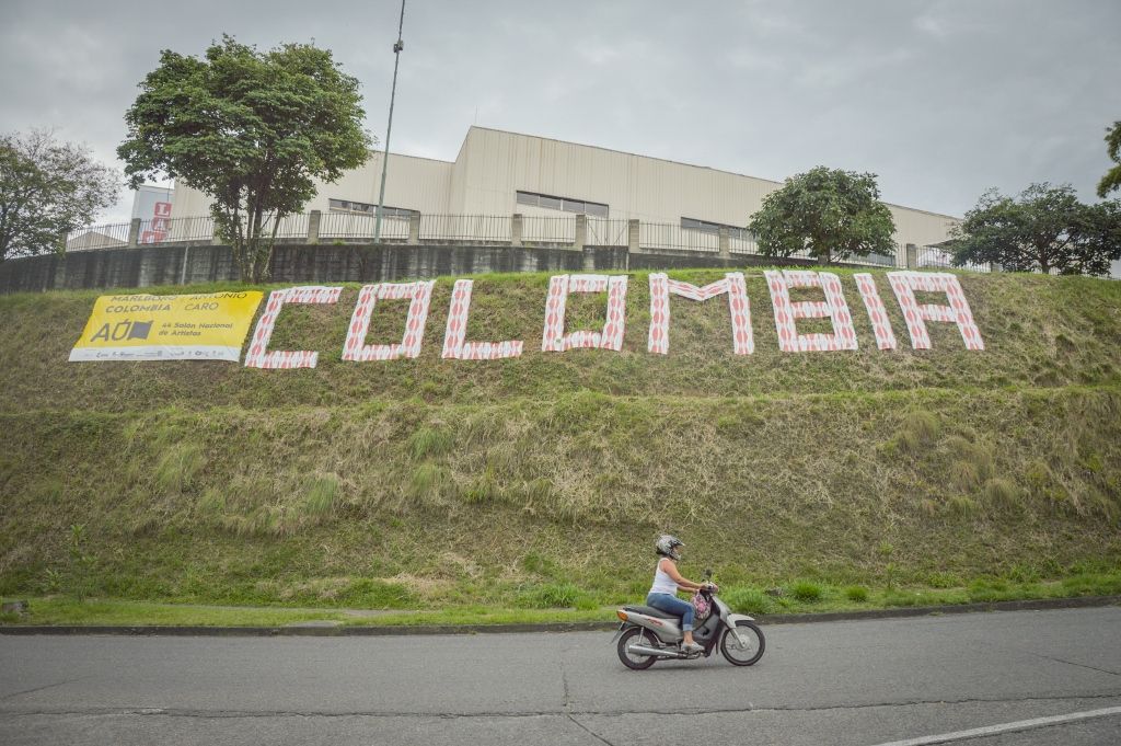 La obra de Antonio la tenían pensada para un morro al frente del Museo de Pereira, ahí afuera de un almacén de cadena, cuyo nombre no sé, ni me importa. En ese morro, más mal tenido que cualquier cosa, pondríamos la obra de don Antonio. Lo primero que hicimos fue volear guadaña. Yo nunca había prendido una guadaña, pero a mi esas cosas me causan intriga y dije: «venga yo arranco». Los otros parecían tampoco haber manejado esa máquina así que aceptaron. Ahí estuvimos la maricadita de dos días, pelando el morrito (que resultó morrote). Cuando ya lo teníamos arreglado, todos devastados y cansados, el man que era como el semijefe (el jefe debajo del jefe, que en este caso se llama “asistente de curaduría”), nos dijo que montáramos la obra. Era un letrero de «Colombia» hecho con la imagen de Marlboro, lo habían mandado a hacer gigante. Me acordé de una obra que hice hace un tiempo, que se llama “Si es grande es arte”, una charla que quizás tengamos después, para no perder el hilo con don Antonio.